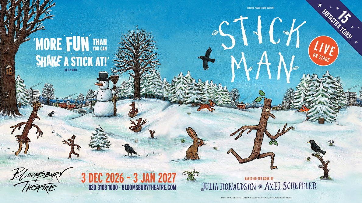 Family-favourite show Stick Man is returning to London for its 15th annual festive season, alongside its first season in Sheffield. It will open at the Bloomsbury Theatre on 3rd December 2026 and run until 3rd January 2027.